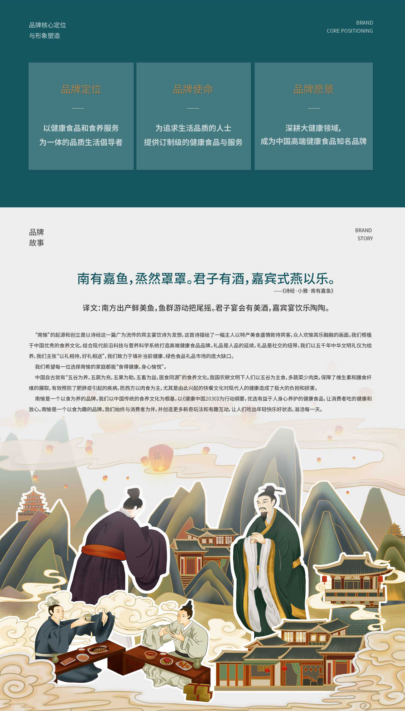 石特將南愉定位為“以健康食品和食養服務為一體的品質生活倡導者”的品牌,將“食在健康,時有南愉。”作為南愉品牌的SLOGAN,利用簡短有力的文字傳達南愉品牌調性。在logo設計上,將品牌名和“中國結、中式鏤空花窗及樹葉”這些極具代表中國的古典元素巧妙結合,利用中式古典的風格進行視覺呈現。在包裝設計上,注入”仁、禮、義、勇、敬”的中國傳統文化,結合產品特性,尋找到高度的契合點,以原創手繪插畫的創意表現形式,將文字、畫面、故事等融入產品包裝設計中,充分為南愉賦予豐富的文化內涵。無論是從策劃還是到視覺呈現效果上,我們注重突顯出南愉的文化內涵與品牌價值,進而提升品牌的附加值。