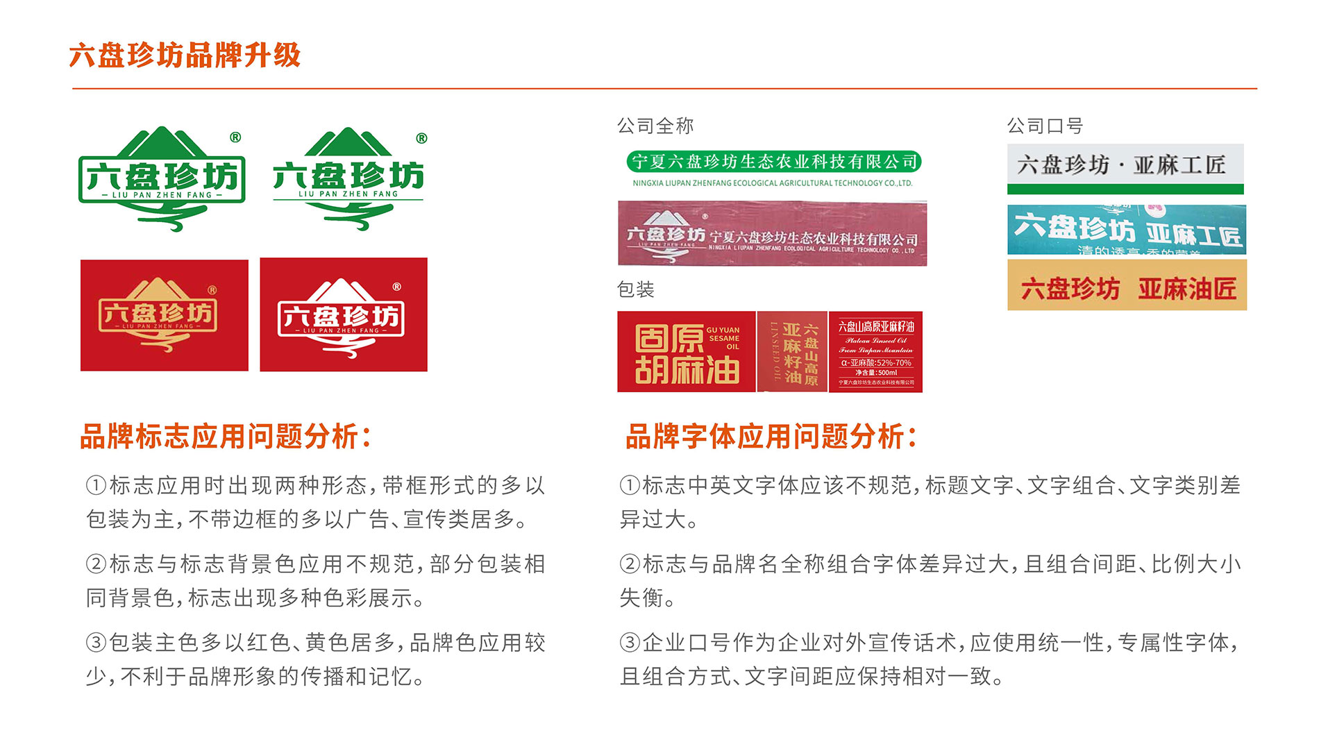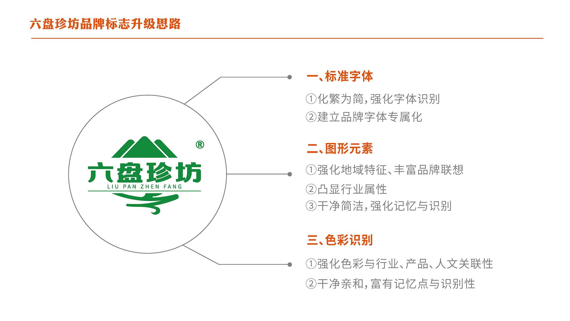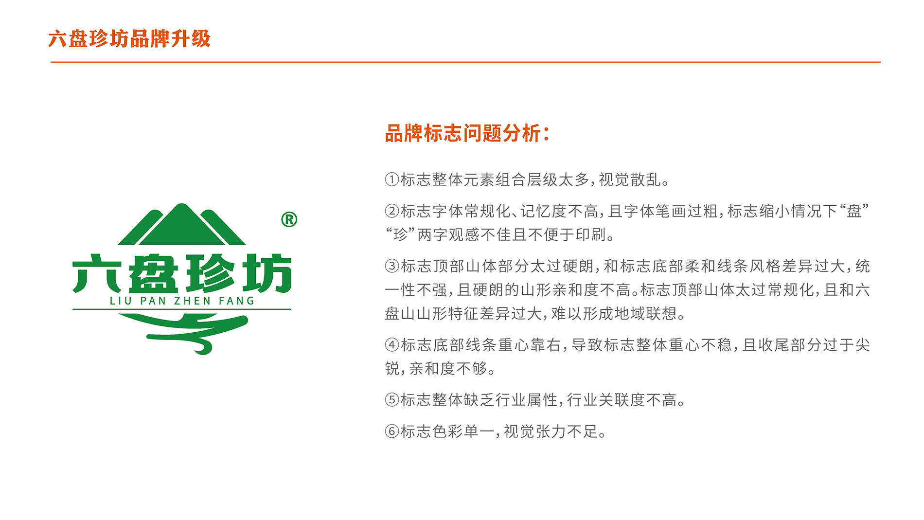 ①標志整體元素組合層級太多,視覺散亂。②標志字體常規化、記憶度不高,且字體筆畫過粗,標志縮小情況下“盤”“珍”兩字觀感不佳且不便于印刷。③標志頂部山體部分太過硬朗,和標志底部柔和線條風格差異過大,統一性不強,且硬朗的山形親和度不高。標志頂部山體太過常規化,且和六盤山山形特征差異過大,難以形成地域聯想。④標志底部線條重心靠右,導致標志整體重心不穩,且收尾部分過于尖銳,親和度不夠。⑤標志整體缺乏行業屬性,行業關聯度不高。⑥標志色彩單一,視覺張力不足。