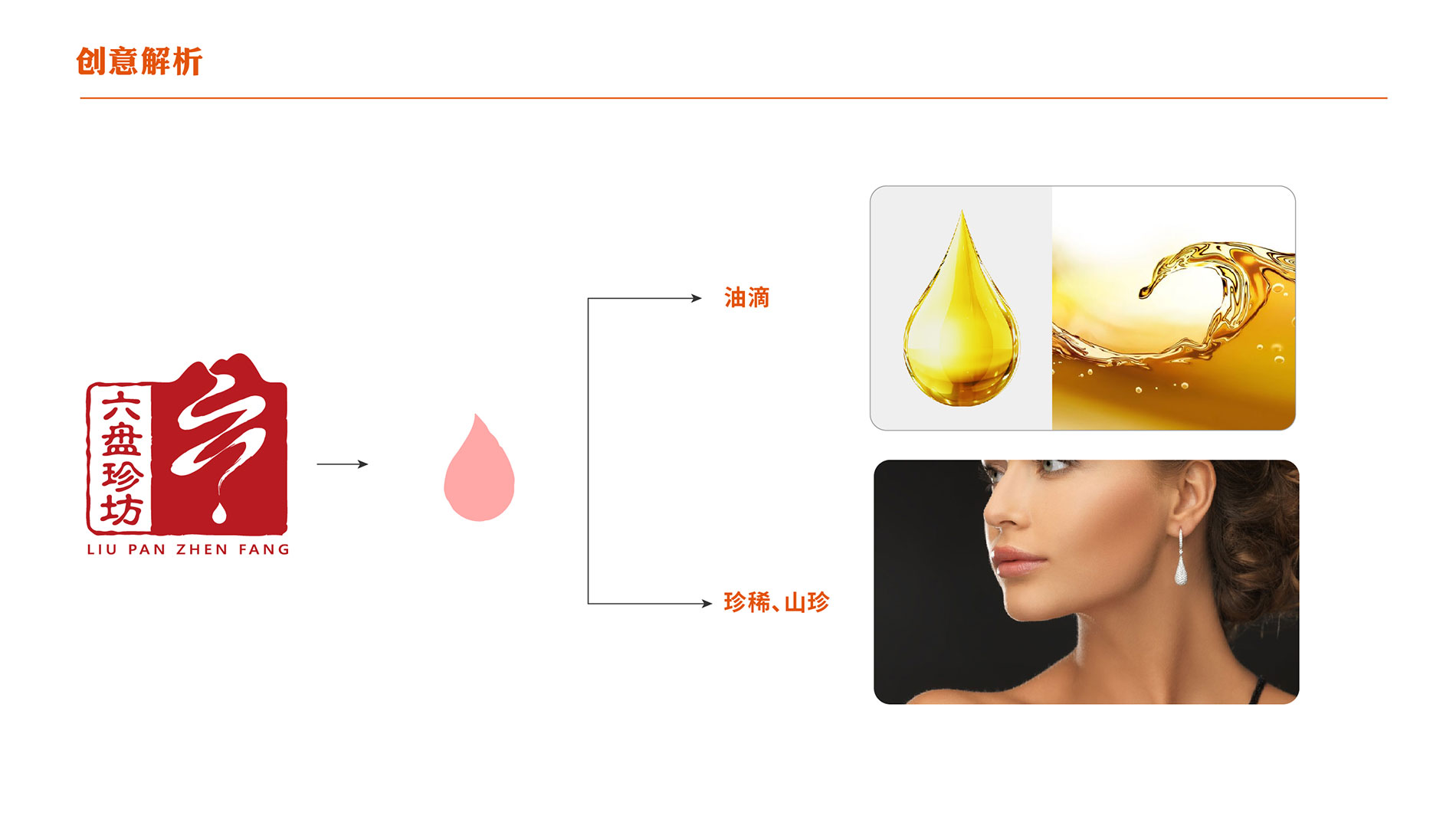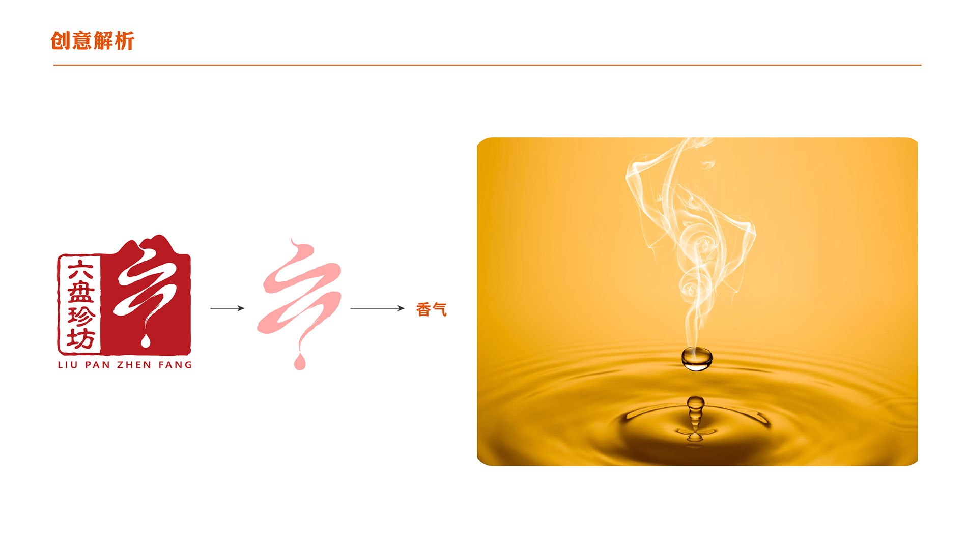 三、油滴:圖形底部油滴形態的融入,與企業食用油產品液體特性相呼應,凸顯品牌行業屬性。油滴的形態也如同鉆石,鉆石具有稀有、珍貴性,與品牌名中“珍”字形成聯想和呼應?!傲弊峙c液滴的融合,整體如同匯山川之精華于一滴,凸顯企業產品品質?!傲弊謺ㄐ螒B,也如同煙霧一般,與油滴的形態相融合,如同油滴正在散發清香之氣,彰顯產品品質的同時,也使logo更具動態感。