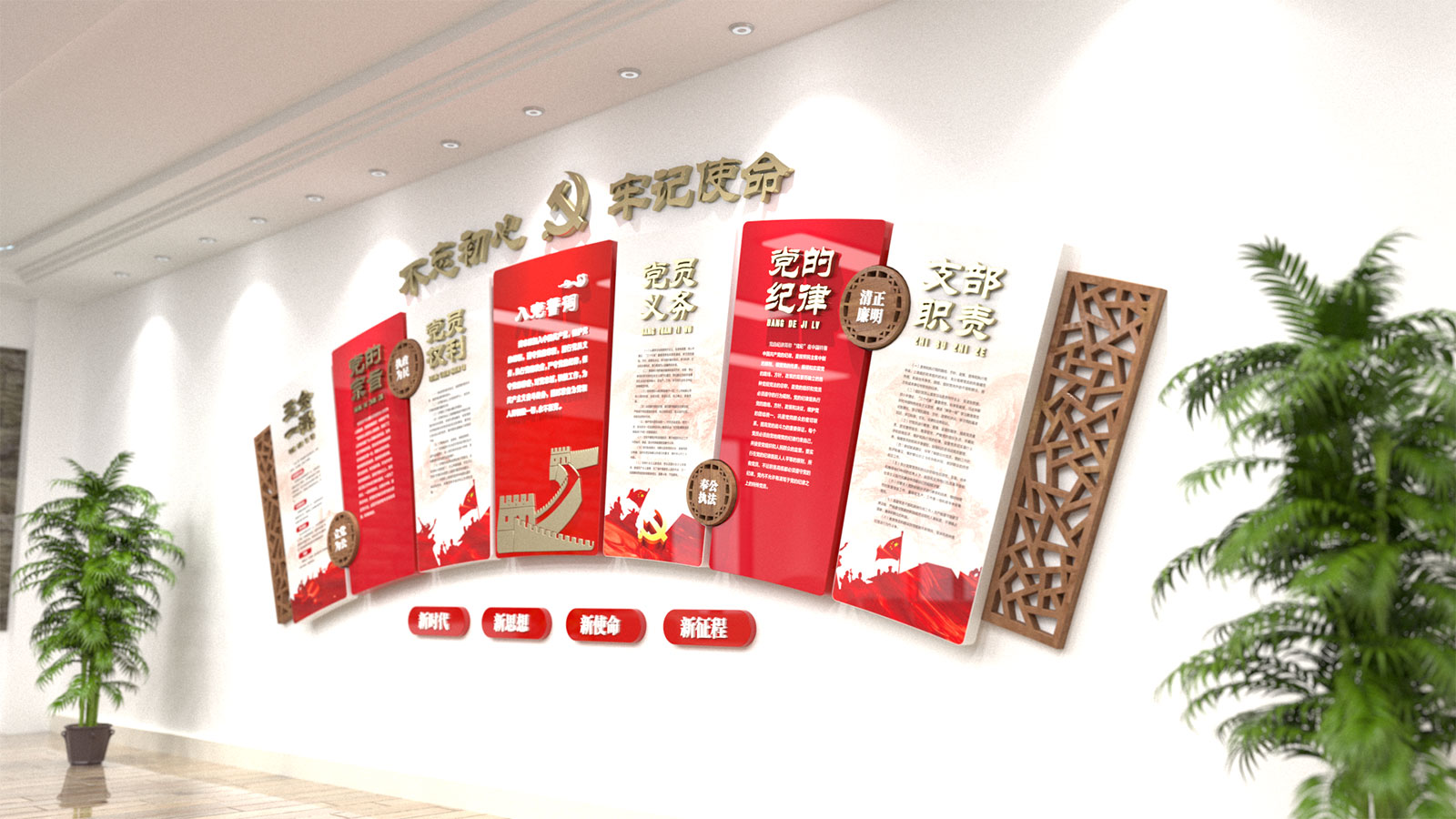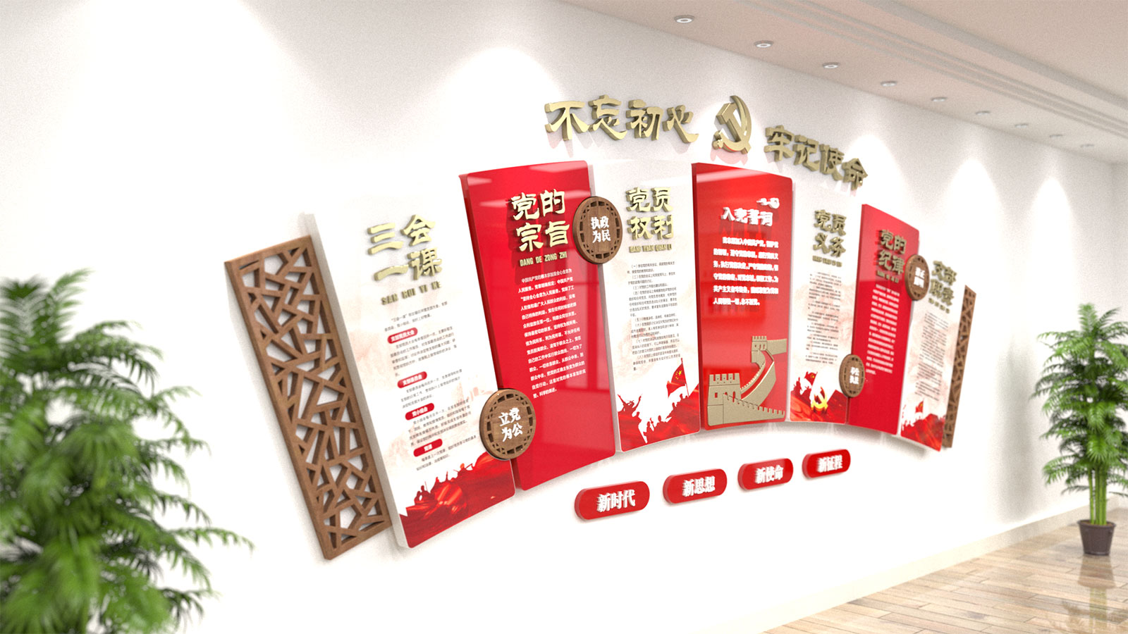 黨建文化墻適用于比較大的前廳,進行政務公開、黨務公開的政策宣傳地方使用。通過文化墻推廣宣傳,借墻接穩地氣,裝點了企業文化環境,進一步提升基層黨建的文化內涵,使廣大黨員職工在濃厚的文化氛圍中增長知識,提振精神,凝聚合力,堅定信心永遠跟黨走。