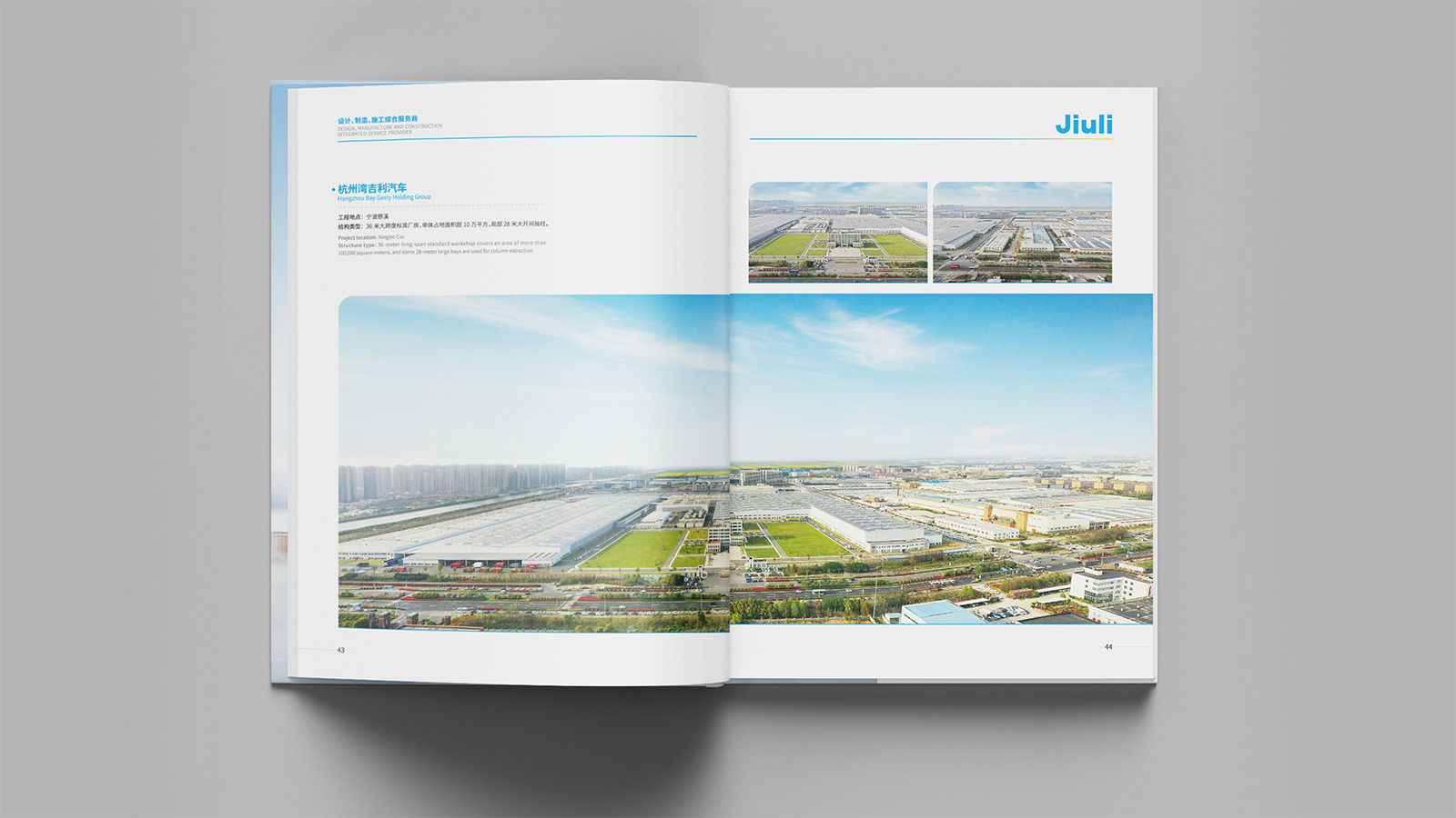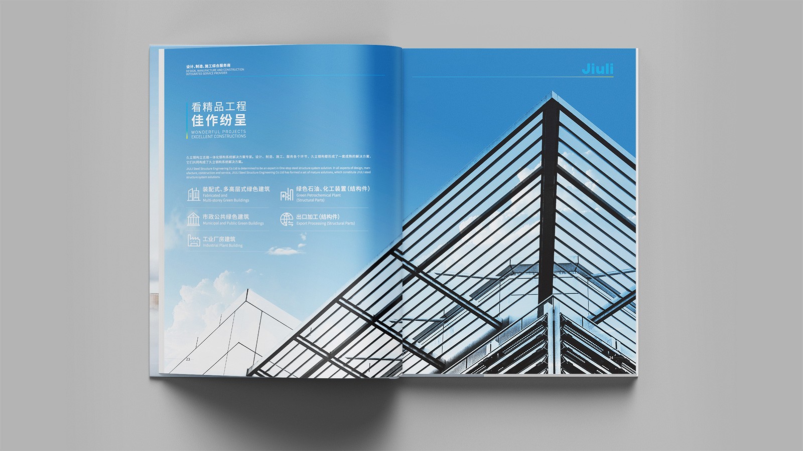 浙江久立鋼構工程有限公司創(chuàng)建于2001年2月,地處中國經(jīng)濟最具活力之稱的“長三角”太湖南岸——浙江省湖州市,是久立集團的全資子公司,公司建有完善的質保體系,通過了ISO9001:2015質保體系的認證。擁有建設部頒發(fā)的鋼結構專業(yè)承包壹級資質。承接各類工業(yè)與民用鋼結構的設計、制造和安裝。公司立足國內(nèi)市場,目前已在全國建立多個營銷辦事處,逐步形成了輻射全國的營銷網(wǎng)絡,并積極參與國際競爭。“以成熟的技術和可靠的產(chǎn)品質量服務用戶,貢獻社會,發(fā)展自己”是久立的文化,可見公司對宣傳冊設計有著較高的要求,因此委托石特設計一本體現(xiàn)公司理念的宣傳冊。