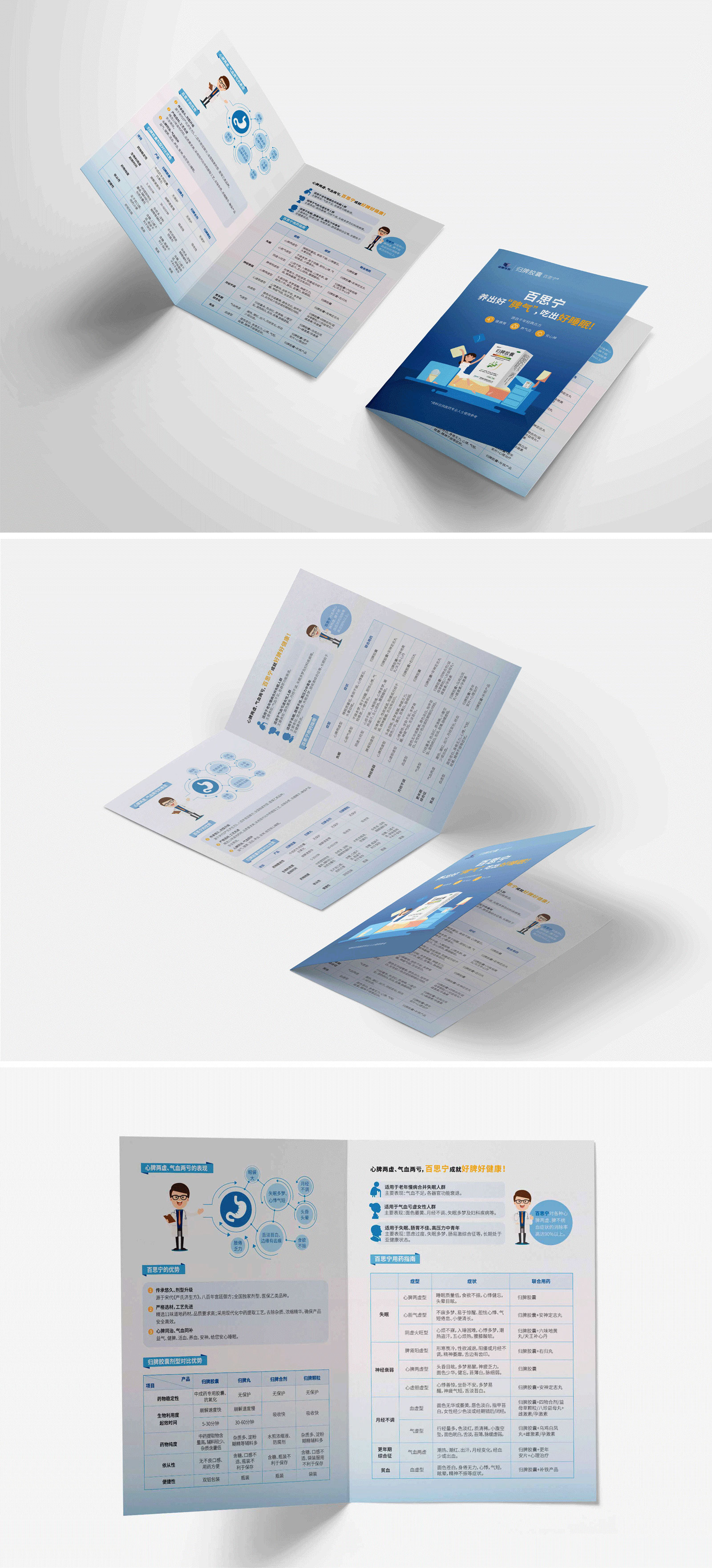 石特考慮到宣傳折頁具有針對性.獨立性和整體性的特點,因此在此次的設計中,石特根據藥品特點,藥物療效、及使用人群等方面進行構思:折頁的封面主要采用扁平化的設計風格,主畫面以“歸脾膠囊”藥物為重點,同時將產品賣點進行突出;在內頁的設計上,以精煉的語言將歸脾膠囊的優勢、用藥指南以表格進行呈現,直觀明了,便于閱讀;除此之外,還以小圖標等形式增加畫面閱讀趣味性與可讀性。折頁總體風格簡約、主次分明、要點突出,不僅有助于加強購買者對藥品的了解.還能進一步強化廣告的效用。