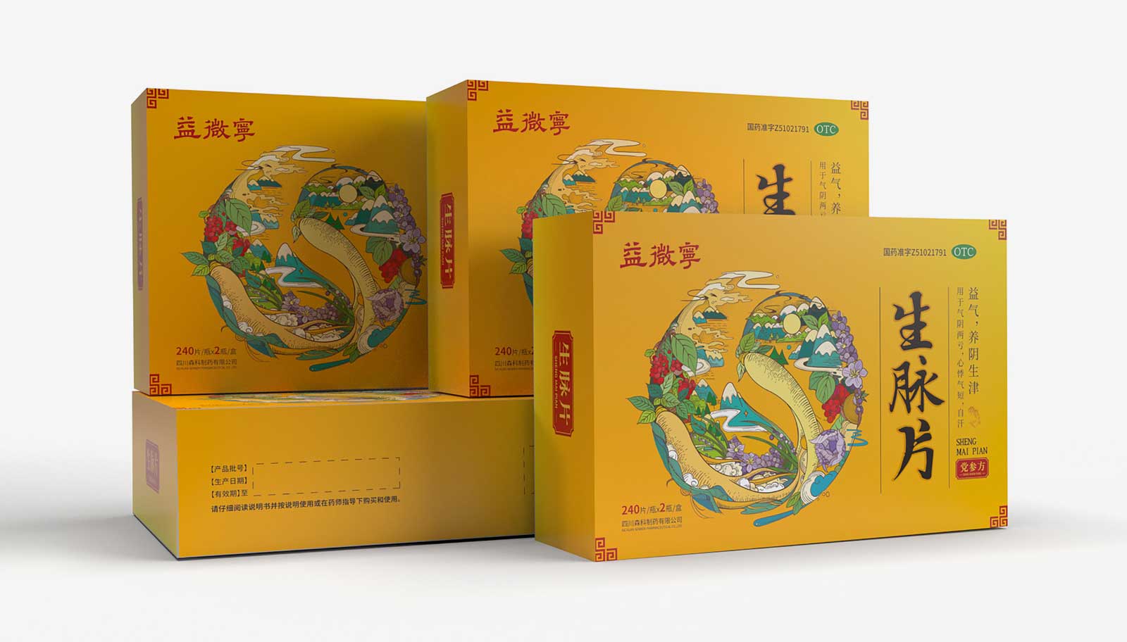 設計方案中產品材料圖樣放于主畫面起到強調作用。本著審美與實用相統一的原則,此處圖案為八卦造型與三味藥材(黨參、麥冬、五味子)插畫的結合作為包裝主畫面。線條、色塊清晰明快,既能凸顯藥材的陰陽調和作用,也能增加產品的視覺沖擊力并加入中國傳統紋樣。