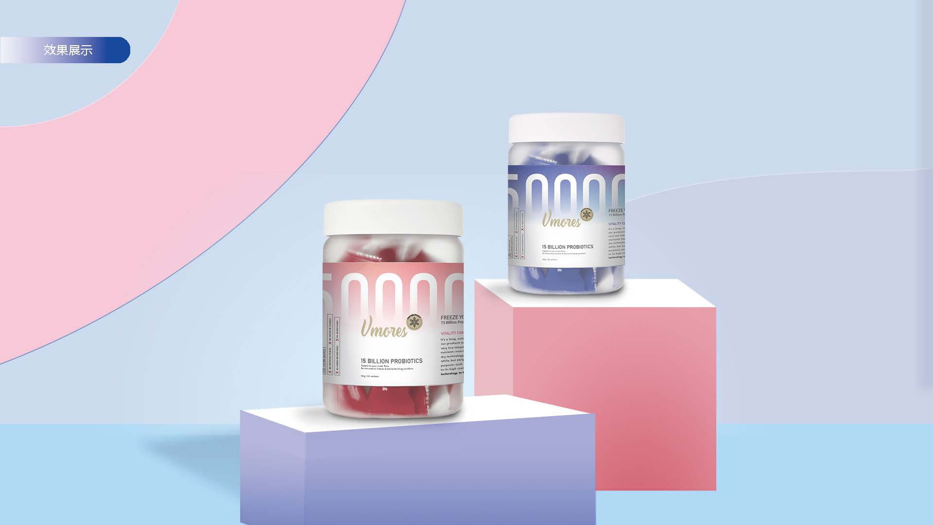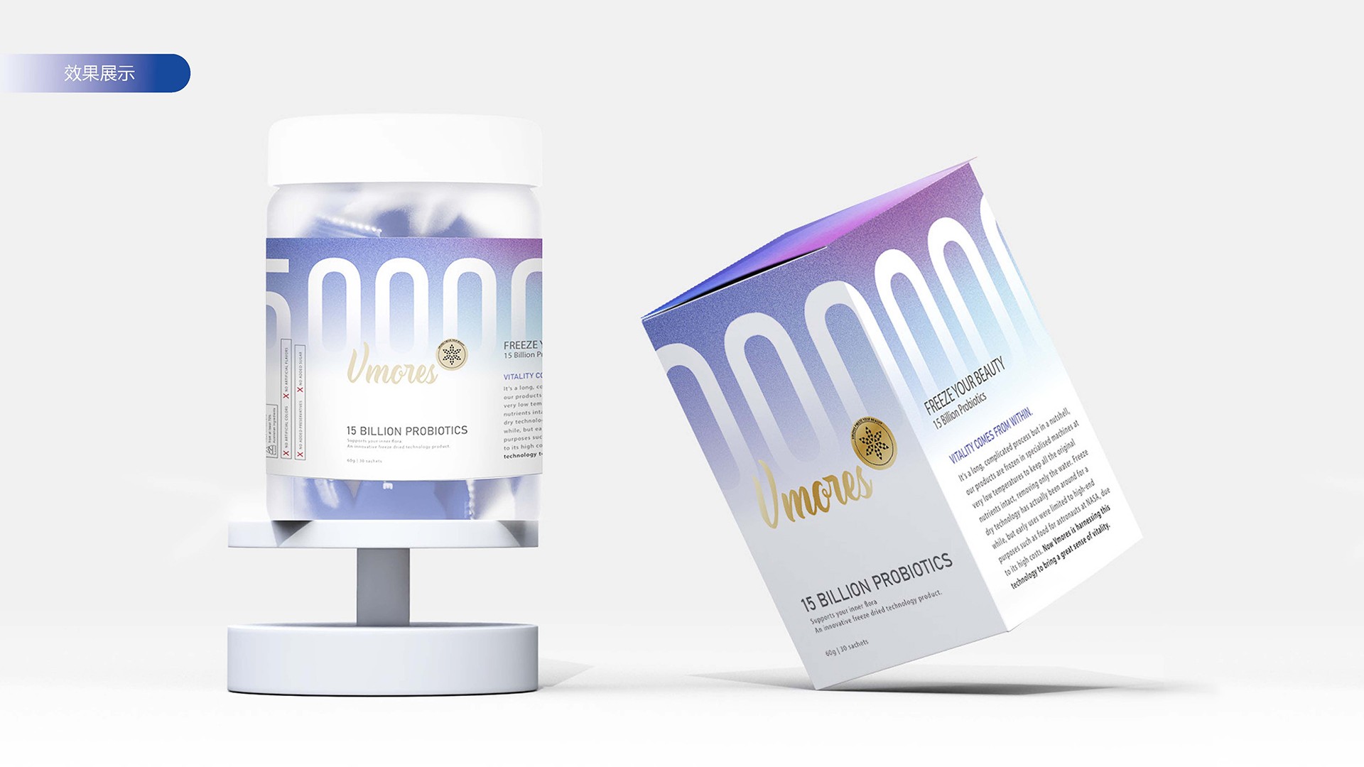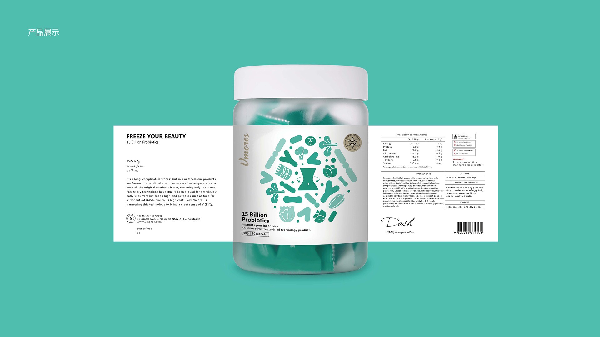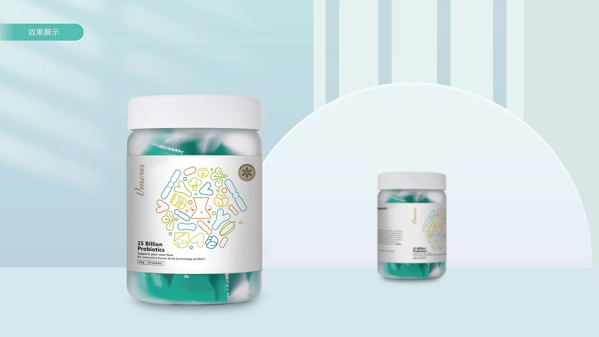 突出150億益生菌,以大額數字吸引眼球;將數字設計成腸道形狀,表現“瘦子菌”是腸道中的有益菌群,產品有益與腸道的功效;整體使用多彩的漸變色,符合產品調性及目標群眾的審美。此款包裝設計將產品效果和成分,以抽象的形式表現出來,插圖中心是瘦身效果,為產品功效,周圍是三種有益菌群,六種超級蔬菜的組合;說明產品營養健康,配色清新活波,較為年輕化。