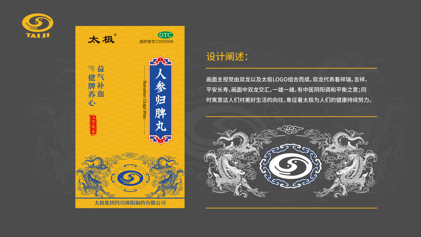 畫面主視覺由雙龍以及太極LOGO組合而成,雙龍代表著祥瑞,吉祥平安長壽,畫面中雙龍交匯,一雄一雌,有中醫陰陽調和平衡之意;同時寓意這人們對美好生活的向往,象征著太極為人們的健康持續努力。中國傳統紋樣--云紋,寓意吉祥,安康。畫面色調以黃藍為主,是中國傳統顏色,在古代是帝王的象征,象征著品質與尊貴。