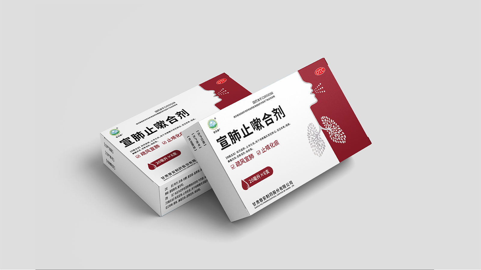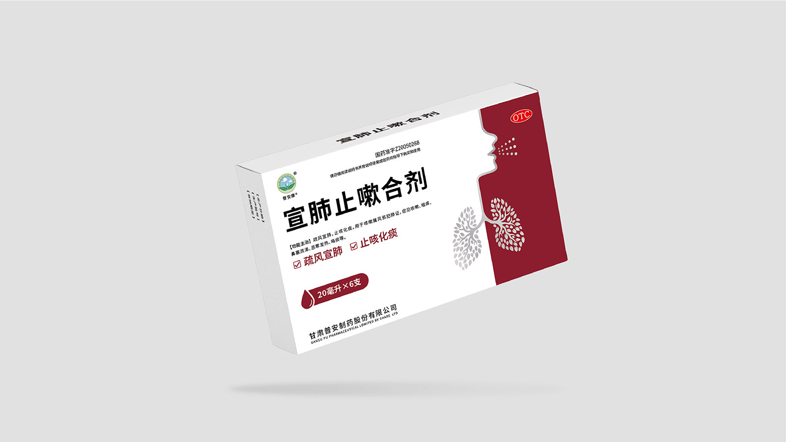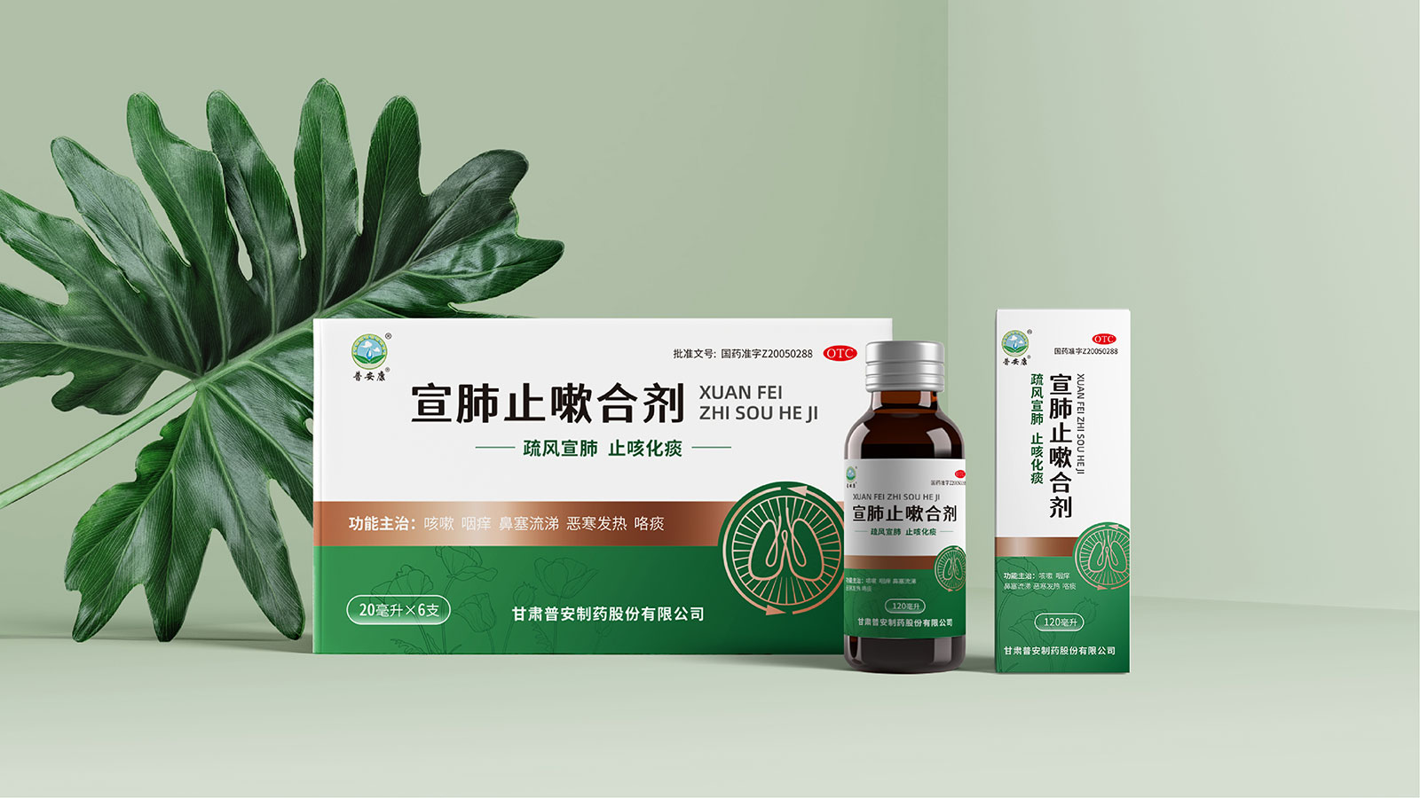 包裝整體風(fēng)格以極簡(jiǎn)為主,在凸出產(chǎn)品通用名的同時(shí),將產(chǎn)品核心主治功能——疏風(fēng)宣肺、止咳化痰以簡(jiǎn)潔圖案展示于畫(huà)面,并作為畫(huà)面核心視覺(jué)元素。產(chǎn)品成分以中草藥為主,又聯(lián)想到產(chǎn)品功能主治特征,顧將兩者結(jié)合,用代表中草藥的樹(shù)葉和肺的整體形態(tài)進(jìn)行融合、替換,凸顯產(chǎn)品中成藥屬性,將肺、呼吸道、人物側(cè)臉剪影和代表呼吸感的小點(diǎn)相結(jié)合,呼應(yīng)產(chǎn)品主治功能特征。考慮到產(chǎn)品性狀為液體形態(tài),因此將代表液體的水滴形態(tài)融合畫(huà)面和產(chǎn)品規(guī)格相結(jié)合,并做強(qiáng)調(diào)處理,凸顯產(chǎn)品性狀的同時(shí)以便于消費(fèi)者準(zhǔn)確查看及區(qū)分產(chǎn)品不同規(guī)格。