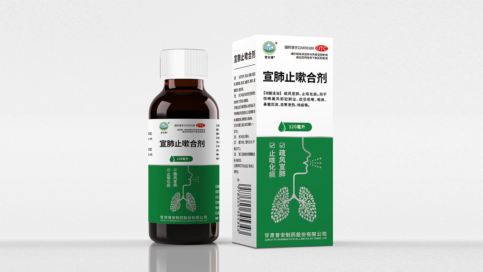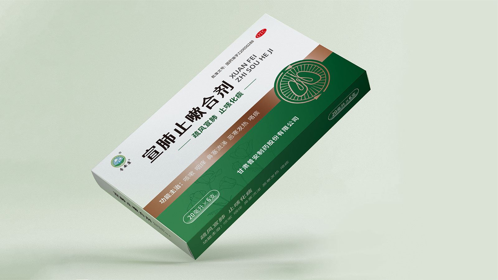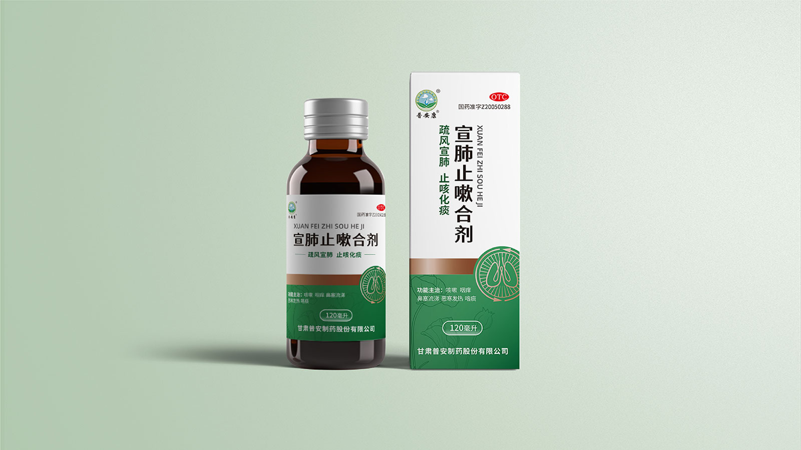 包裝整體風(fēng)格以極簡(jiǎn)為主,在凸出產(chǎn)品通用名的同時(shí),將產(chǎn)品核心主治功能——疏風(fēng)宣肺、止咳化痰以簡(jiǎn)潔圖案展示于畫(huà)面,并作為畫(huà)面核心視覺(jué)元素。產(chǎn)品成分以中草藥為主,又聯(lián)想到產(chǎn)品功能主治特征,顧將兩者結(jié)合,用代表中草藥的樹(shù)葉和肺的整體形態(tài)進(jìn)行融合、替換,凸顯產(chǎn)品中成藥屬性,將肺、呼吸道、人物側(cè)臉剪影和代表呼吸感的小點(diǎn)相結(jié)合,呼應(yīng)產(chǎn)品主治功能特征。考慮到產(chǎn)品性狀為液體形態(tài),因此將代表液體的水滴形態(tài)融合畫(huà)面和產(chǎn)品規(guī)格相結(jié)合,并做強(qiáng)調(diào)處理,凸顯產(chǎn)品性狀的同時(shí)以便于消費(fèi)者準(zhǔn)確查看及區(qū)分產(chǎn)品不同規(guī)格。
