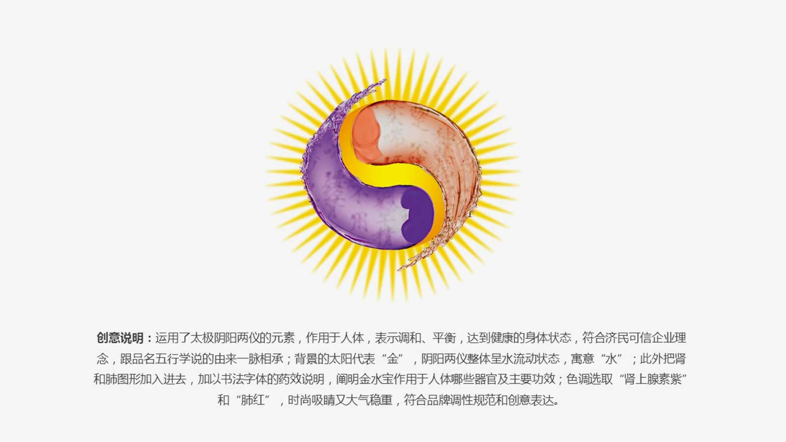 運(yùn)用了太極陰陽兩儀的元素,作用于人體,表示調(diào)和、平衡,達(dá)到健康的身體狀態(tài),符合濟(jì)民可信企業(yè)理念,跟品名五行學(xué)說的由來一脈相承;背景的太陽代表“金”,陰陽兩儀整體呈水流動(dòng)狀態(tài),寓意“水”;此外把腎和肺圖形加入進(jìn)去,加以書法字體的藥效說明,闡明金水寶作用于人體哪些器官及主要功效;色調(diào)選取“腎上腺素紫”和“肺紅”,時(shí)尚吸睛又大氣穩(wěn)重,符合品牌調(diào)性規(guī)范和創(chuàng)意表達(dá)。
