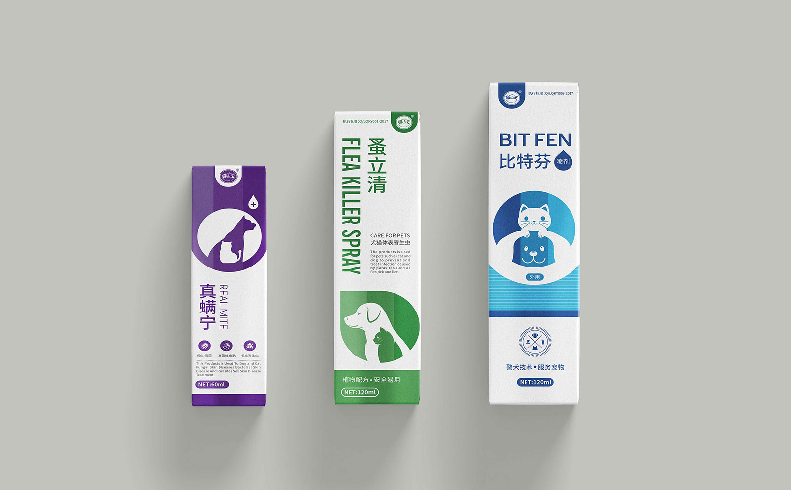 其一比特芬噴劑是依托貓山王品牌優勢、借鑒國際先進皮膚護養技術、加以工藝創新形成的護理產品。有一定的科技基礎,所以在顏色的選擇上采用藍色更富科技感,因為是噴劑,結合水滴形狀進行設計;其二蚤立清噴劑采用植物活性驅蟲成分,所以在顏色的選擇上采用綠色,更富自然無害的感官體驗;其三真螨寧噴劑依據犬、貓皮層特點及致病菌的微生物特征,采用最新的生物提取PH抗真菌因子和透皮高滲技術研制而成,在顏色的選擇上采用紫色,代表權威,也正好印證了貓山王在行業中的地位。通過包裝升級后,三款產品在外在上統一了形象,更適合系列購買,一站式解決寵物難題。
