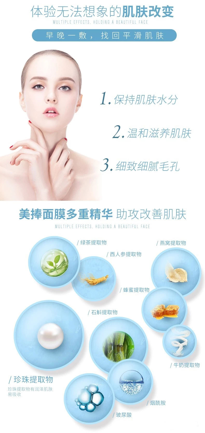 產(chǎn)品說(shuō)明: 蘊(yùn)含透明質(zhì)酸、珍珠提取物、酵母發(fā)酵產(chǎn)物提取物,補(bǔ)充肌膚水分,滋潤(rùn)保濕,溫和滋養(yǎng),細(xì)致毛孔, 舒緩修護(hù),長(zhǎng)期使用令肌膚更加細(xì)致光滑。